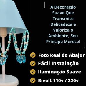Artesanal, design moderno, ideal para decoração de quarto de crianças, bebê, ilumina muito bem e realça o ambiente. Especificações abajur: - cúpula de polipropileno plástico resistente na cor azul bebê; - base em acrílico branco; - haste de acrílico branco; - pingentes de coração azul, pérolas coloridas; - altura total do abajur 30 cm; - diâmetro maior da cúpula mede 17 cm; - soquete para lâmpadas modelo e-27 bivolt aceita lâmpadas 110v e 220v ; - usar lâmpada de no máximo 40w lâmpada não incluso ; - importante: imagens reais do produto, porém as cores dos pingentes e pérolas podem variar de acordo com cada produto fabricado, conforme disponibilidade Do atenção mamãe grande por tempo limitado Marca: Não Informado