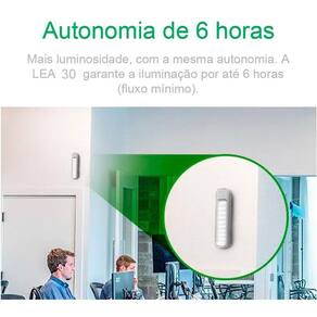 A lea 30 com seu design moderno e discreto é ideal para ambientes de até 30m. Tenha segurança e conforto nas quedas de energia elétrica e situações de emergência, com acendimento automático e sistema antifurto, garantirá a comodidade e segurança do usuário. Fácil instalação, baixo consumo de energia elétrica e alta durabilidade.