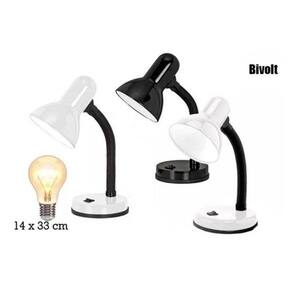 Luminária de Escrivaninha Bivolt Econômica LED Especificações: Material: Plástico e metal Dimensões: 33 cm de altura x 14 cm de largura Base: 14,5 cm de diâmetro Corpo: Flexível, com cúpula fixa Fonte de energia: Tomada de 2 pinos Compatível com: Lâmpadas LED não inclusa Voltagem: Bivolt automático Peso: 475g Funcionalidades / Para que serve: Ideal para ambientes de estudo, leitura, trabalho e home office, essa luminária proporciona iluminação direcionada, eficiente e econômica. Seu design compacto se encaixa perfeitamente em mesas de cabeceira, escrivaninhas e bancadas, otimizando o espaço com praticidade. O uso com lâmpadas LED oferece baixo consumo de energia, contribuindo para a economia doméstica. Descrição: Com visual moderno e estrutura metálica resistente, a luminária de mesa combina estilo e funcionalidade. Seu corpo flexível e base firme proporcionam estabilidade e conforto visual, com luz precisa para atividades que exigem concentração. O sistema bivolt automático facilita o uso em diferentes ambientes, sem necessidade de adaptadores. Seu design clean e versátil combina com qualquer estilo de decoração, e a limpeza é simples, exigindo apenas um pano seco ou levemente úmido. É a escolha ideal para quem busca uma solução prática, econômica e elegante no dia a dia. O que contém: 01 Luminária de Mesa Bivolt cor : branco ou preto Marca: Não Informado