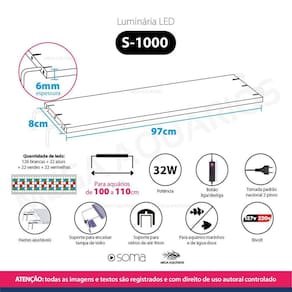 A Luminária Soma S1200 é a escolha perfeita para quem busca uma iluminação de qualidade e eficiência para o seu aquário. Garanta já a sua e deixe seu aquário ainda mais bonito e iluminado. Ean: 7792647753168