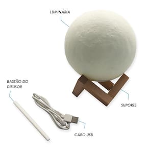 Luminaria de lua umidificador Luminaria de lua umidificador desenvolvida com tecnologia 3d, em formato de lua cheia, essa luminária será um belo item de decoração para sua casa. Possui 3 variações de cor, que você pode mudar conforme toque, acompanha um suporte de madeira que impede a lua de ficar no chão, além de deixar ainda mais bonito o objeto. a luminária é 2 em 1, sendo também um umidificador de ar. É ideal para dias mais secos e, principalmente para ambientes com ar condicionado. Basta adicionar um pouco de água e algumas gotas de óleo essencial de sua preferência. possui 07 diferentes cores, deixando o ambiente na tonalidade escolhida.- é preciso apertar o pino até a cor que deseja. Modo de usar 1. Abra a tampa do reservatório.2. Coloque o bastão do difusor na tampa do reservatório.3. Adicione água ao reservatório.4. Feche a tempa firmemente. informações: - conta com luz de led trazendo mais economia, diferente das demais. - difusor com aromas. - melhora a respiração graças ao umidificador. - entrada usb acompanha cabo .- controle da iluminação e umidificação por pinos metálicos dispostos na tampa. - a névoa do umidificador sai através de um pequeno buraco embaixo da lua. especificações:material: pvc, madeira e componentes eletrônicos. dimensões:- diâmetro da lua: 15cm.- altura com suporte: 20cm. peso: 0,260g aprox. capacidade liquida: 1200ml.Potência max: 2w.Corrente: 400mavoltagem: 5vduração: + ou - 30hr. - acompanha usb. contém01 luminária umidificador 3d formato de lua com suporte de parede