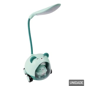 Luminária de Mesa 30cm LED Urso e Apontador Transforme sua mesa com esta luminária super funcional e adorável! A Luminária de Mesa é perfeita para quem busca estilo, praticidade e organização em um só produto. Com design fofo de urso, ela possui iluminação LED RGB com efeito colorido, apontador embutido, porta-objetos funcional e ainda conta com bateria recarregável via USB, garantindo mobilidade total e economia de energia.\nIdeal para quartos infantis, escritórios, home office ou como presente criativo e útil, Crie uma iluminação divertida e relaxante com suaves. Perfeito para estudantes e artistas, tudo ao alcance da mão. Ajuste a direção da luz com facilidade. A haste flexível permite rotacionar e direcionar a luminária como preferir. conta com bateria recarregável via USB, garantindo mobilidade total e economia de energia.\nDisponível em cores.\nEspecificações:\nMarca : TINGS\nTipo de material : Componentes Eletrônicos, Plástico\nCores ou Estampa : Color\nDimensões do Produto : 30 X 7 X 8 CM\nDimensões da Embalagem : 14 X 10 X 10 CM\nPeso Bruto (Gramas) : 0.146