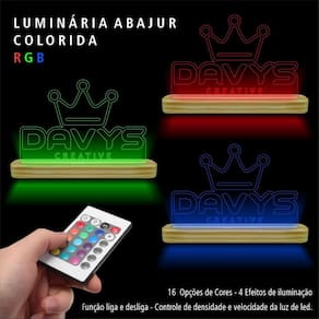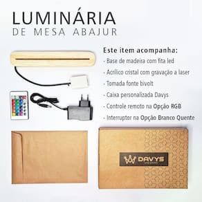 Decore e ilumine seu ambiente com muito estilo e personalidade. Ótima opção para quem deseja decorar o ambiente com muito bom gosto e deixar sua casa ainda mais bonita. A arte de decorar vai deixar o seu espaço mais acolhedor, moderno e, principalmente, com a sua cara. Características: - Base de madeira com fita led - Acrílico com gravação a laser - Tomada Bivolt - Controle remoto no produto com a Opção RGB Especificações técnicas: Marca: Davys Creative Modelo: Luminária Abajur Cor opcional: RGB colorido Ambientes Recomendados: Interno Acompanha Caixa personalizada Davys Dimensões: 25x17x5 : 30 dias FABRICAÇÃO PRÓPRIA Ean: 7898928709722