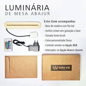Decore e ilumine seu ambiente com muito estilo e personalidade. Ótima opção para quem deseja decorar o ambiente com muito bom gosto e deixar sua casa ainda mais bonita. A arte de decorar vai deixar o seu espaço mais acolhedor, moderno e, principalmente, com a sua cara. Características: - Base de madeira com fita led - Acrílico com gravação a laser - Tomada Bivolt - Controle remoto no produto com a Opção RGB Especificações técnicas: Marca: Davys Creative Modelo: Luminária Abajur Cor opcional: RGB colorido Ambientes Recomendados: Interno Acompanha Caixa personalizada Davys Dimensões: 25x17x5 : 30 dias FABRICAÇÃO PRÓPRIA Marca: Não Informado