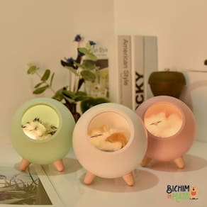 E para o toque final, a luminária acompanha um gatinho de pelúcia, que a deixa mais fofa e charmosa.