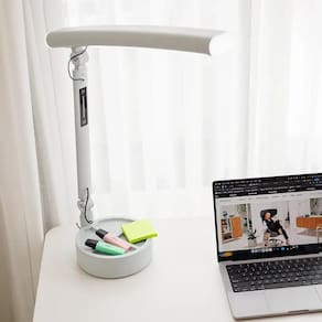 Iluminação e Organização Além de iluminar o ambiente, a luminária otimiza seu espaço com um porta-objetos integrado na base, ideal para armazenar pequenos itens e manter a mesa sempre organizada.