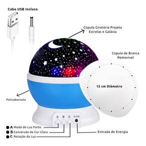 Descrição: É ideal para quem vive sonhando com estrelas ou curte um belo céu estrelado. Ideal para quarto de crianças e bebês, proporciona um soninho tranquilo, ao mesmo tempo em que desperta sua imaginação e curiosidade natural. Jovens e adultos também podem desfrutar de bons momentos aproveito o brilho e a luminosidade. Ideal para baladas, festas de aniversário, momentos românticos ou simplesmente para aproveitar um tempo em família. Graças as opções de cores e movimento, o céu estrelado deixa espaço para a sua criatividade. Crie um ambiente mágico de noite estrelada, com cintilantes estrelas estáticas ou em movimento. Além disso, ao colocar a cobertura branca concentra os efeitos dentro da própria luminária, podendo ser opção de abajur estrelado.