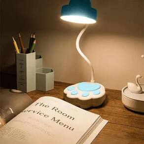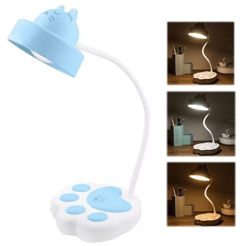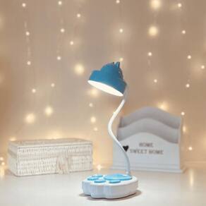 Luminaria Haste flexível Cúpula de gato Base em formato de pata Led 20 leds Bateria Luz indicativo de que esta carregando na parte traseira Botao on/off Touch Controle de intensidade Três variações de luz Branco frio, misto e branco quente Cabo usb Potência: 2.5w 1200 mah Duração da bateria: 4 a 5 horas aproximadamente Material: polipropileno Cor: branco e azul