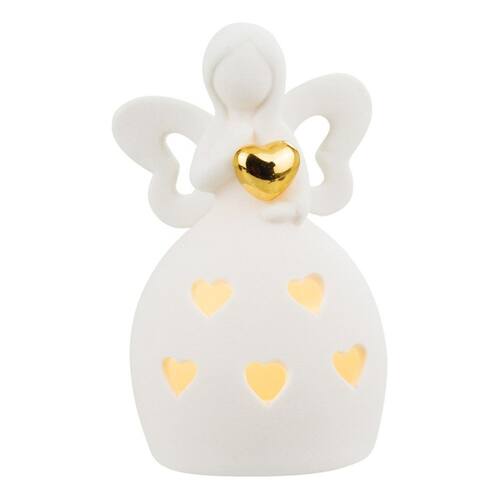Enfeite de resina do formato de um anjo branco com 11 cm de altura segurando um coração dourado. Interior com pequena lâmpada que ao acender ilumina a base do anjo. Material: resina; Funcionamento: 2 baterias LR44