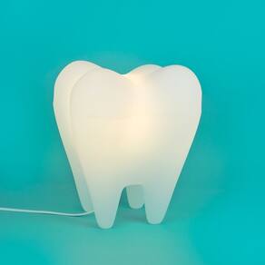 Esta luminária 3D, em luz branca, esbanja criatividade ao imitar o formato de dente.