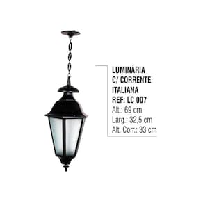 Luminária Externa Interna Italiana Com Corrente em Alumínio Luminárias de teto para jardim, ideal para condomínios, jardins, praças, parques, estacionamentos, vias urbanas e áreas externas e internas em geral. Pode ser utilizada em regiões de praianas, pois não sofre ação da maresia. Ótimo custo benefício.