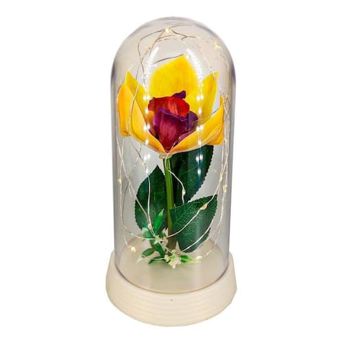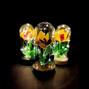 Detalhes: Luminária com 10 cm de diâmetro por 19 cm de altura; Base de plástico, na cor ouro velho; Cúpula de acrílico Flor Lírio artificial; Luzes de led na cor amarela; 2 baterias 2032 (já inclusas).