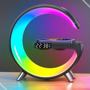 Luminária g led rgb carregador indução relogio despertador Cor: preto Luminária g led rgb com carregador de indução despertador e áudio bluetooth