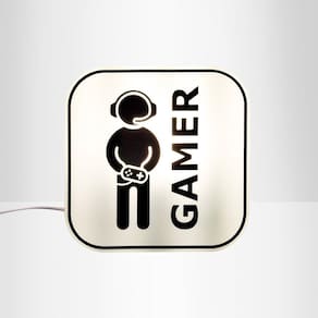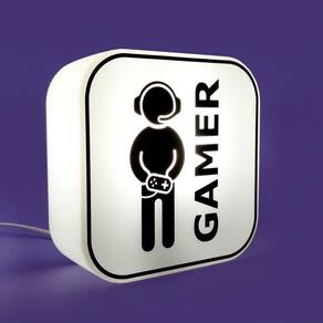 Fixada na parede ou sobre a bancada, a Luminária Gamer possui ilustração de um verdadeiro gamer: controle na mão e fone nos ouvidos. Super moderna, vai iluminar o cantinho favorito de relaxamento e diversão.