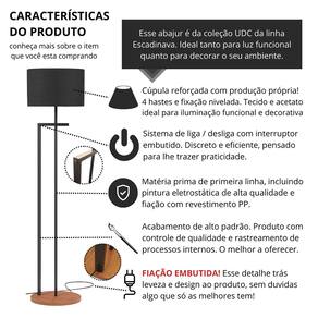 Tipo: Luminária Modelo: Salone Cor tecido: Preto Cor base: Preto Voltagem: Bivolt Acabamento em Pintura Eletrostática Cúpula em Acetato com Acabamento em Tecido Brugges Estrutura em Aço Carbono com Reforço 4 hastes