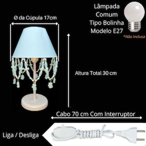 Artesanal, design moderno, ideal para decoração de quarto de crianças, bebê, ilumina muito bem e realça o ambiente. Especificações abajur: - cúpula de polipropileno plástico resistente na cor azul; - base em acrílico branco; - haste de acrílico branco; - pingentes de urso, balinha azul, pérolas, caracol; - altura total do abajur 30 cm; - diâmetro maior da cúpula mede 17 cm; - soquete para lâmpadas modelo e-27 bivolt aceita lâmpadas 110v e 220v ; - usar lâmpada de no máximo 40w lâmpada não incluso ; - importante: imagens reais do produto, porém as cores dos pingentes e pérolas podem variar de acordo com cada produto fabricado, conforme disponibilidade Do atenção mamãe grande por tempo limitado Marca: Não Informado