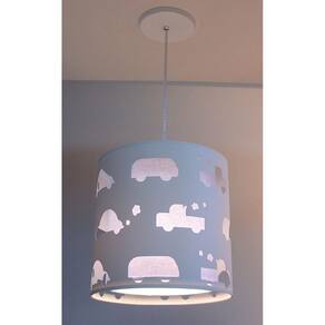 Luminária pendente carrinhos Cúpula externa em laminado plástico flexível (COR BRANCA) com recortes de carrinhos Cúpula interna acabamento em tecido de algodão cor AZUL BEBÊ Dimensões da cúpula: 25cm de diâmetro x 25cm de altura Cabo de energia com 1,20m de comprimento com altura regulável Capacidade para uma lâmpada / soquete rosca comum padrão E27 (lâmpada não incluída) Bivolt (110/220V) Acabamento de teto em alumínio com pintura branca Embalagem: caixa de papelão
