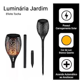 Os leds desta tocha são uma alternativa segura e simples e bonita para decorar qualquer ambiente com um lindo design.Possui uma bateria interna e tem carregamento SOLAR devido ao pequeno e discreto painel que esta na parte de cima da luminária, não é necessário substituir a bateria interna.Resistência às intempéries, À Prova D' Água e Durável.Fácil instalação, não precisa de nenhuma fiação necessária, basta instalá-lo em qualquer lugar que você gosta e desfrutar do ambiente acolhedor luz da tocha.Dicas:Por favor ligue o interruptor antes de usar, Melhorar A vida de serviçoEspecificações:LED: 96 PCSTamanho da cabeça da lâmpada: 19.2*9.7 cmAlimentação: Bateria de 1800 mAh bateria recarregávelTempo de carregamento: 3 ,, 4 horasTempo de trabalho: até 12 horas depois de totalmente carregadaPeso da embalagem: 520gO pacote inclui:1 x Luminária Tocha Fogo1 x Espeto mais extensor para fixaçãoTodos os nossos itens são conferidos e testados antes do envio.Trabalhamos apenas com materiais que conhecemos e confiamos para proporcionar o melhor custo benefício para você.