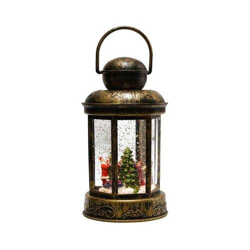 Luminária em forma de lamparina de 19 cm de altura. Interior com enfeite no formato de Papai Noel com uma mulher mexendo na árvore de natal. Duas opções para ligar. Ao ligar de um lado, interior da lamparina se acende e líquido interno começa a se movimentar mexendo a purpurina que tem dentro. Ao ligar para outro lado, além do descrito anteriormente, começa a tocar música natalina.Material: Plástico, líquido e resina; Fontes de alimentação: Cabo USB incluso no produto ou 3 pilhas AAA não incluso ;Medidas: 10x10x19 cm;Peso: 700 gramas.