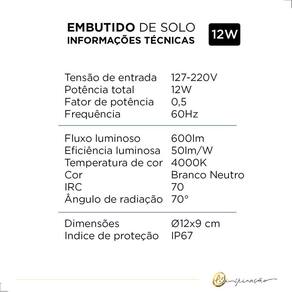 Tensão de entrada: 127-220V Potência total: 12W Fator de potência: 0,5 Frequência: 60Hz Fluxo luminoso: 600lm Eficiência luminosa: 50lm/W Temperatura de cor: 4000K Cor: Branco Neutro IRC: 70 Ngulo de radiação: 70 Dimensões: 12x9 cm Índice de proteção: IP67