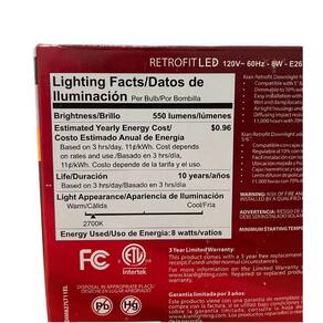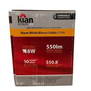 Especificações Técnicas: • Marca: Kian • Linha: Retrofit LED • Modelo: #9DLS5/6DIM827LT11EL • EAN: 811037030011 • Potência: 9W • Fluxo luminoso: 625 lm • Cor da luz: 2700K Warm White • Base: E26 • Equivalência: até 65W • Tensão: 120V • IRC: 80 • Dimerizável: Sim • Vida útil: 11.000 horas • Economia estimada: US$ 67,8 • Material: policarbonato resistente • Classificação: adequada para áreas úmidas • Instalação: molas de torção integradas • Compatível com luminárias 5” e 6” • Temperatura mínima: -30°C • Certificações: FCC, ETL, Intertek • Garantia: 3 anos
