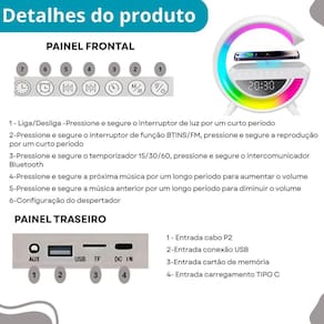 Conteúdo da embalagem: 01 luminária caixa de som carregador indução 01 cabo de carregamento 01 manual 01 fonte
