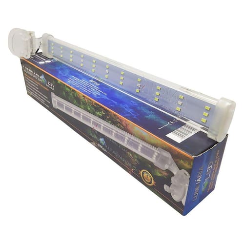 A linha de luminárias WFish é ideal para plantas Low Tech, promova uma excelente iluminação, deixando o ambiente bonito e muito claro.A parte externa é uma calha acrílica para uma maior durabilidade, compacta com suporte ajustável de fácil instalação.Baixa tensão, super segura e maior economia de energia, com seu LED de espectro múltiplo de alta qualidade, branco 8.000k.Excelente escolha para pequenos aquários.Carcaterísticas: Modelo: WFL-40Voltagem: BivoltPotência: 12wTamanho: C:40cm x L: 3,5cm x A: 2cm (Vidros até 15mm)Cor: Branco e AzulQuatidade de Leds: 33 (28 brancos e 5 Azuis)Quantidade de Lúmens: 1420Indicação de Uso: Aquários até 40cm