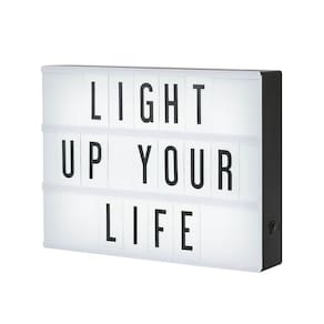 Luminária Led Lightbox painel de cinema Cinema A4 Coloque suas mensagens pessoais no centro das atenções com esta caixa de luz. São três painéis para inserir letras, ícones ou símbolos, permitindo que você coloque a frase que você quiser ou exiba seus ícones favoritos. Ideal para decoração possui um design moderno e retro, desperte sua criatividade e encante a todos com lindas frases motivadoras e de carinho. Seu material e de alta durabilidade e resistência, assim garantindo vida útil ao produto. -------------------------- Características: - Material: Polipropileno - Conexão USB, - Alimentação 3 pilhas AA não inclusas e cabo USB, - Possui letras, números e figuras, - Design moderno, - 90 Letras, numeros e simbolos Dimensões: - Altura: 22 cm, - Largura: 4,0 cm, - Comprimento: 30 cm, Itens inclusos: - 1 painel, - 90 caractere, - 1 cabo usb, 3 Meses de Garantia Contra Defeito de Fabricação 586 Mod: QZ6223-22