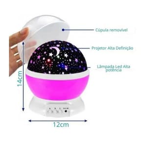 Botão a - liga e desliga a luz Botão b - opções de cores da projeção 4 principais cores + duplas de cores + trio de cores Botão c - liga e desliga a rotação Tampa semi-transparente - podendo usar a luminária com ou sem a tampa, fazendo o céu estrelado ou apenas usando como luminária Não esquenta, mesmo com o uso a noite toda.