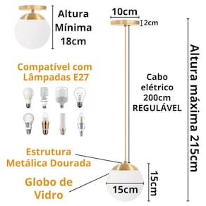 O corpo da luminária é metálico, assim como, a base de teto e a fiação elétrica, também no mesmo tom de cor. Composta por um globo de vidro branco leitoso fosco de 15cm, transmite leveza e organicidade. Acompanha fiação elétrica de 2 metros já instalada no soquete E27. A altura desse cabo elétrico pode ser regulado no momento da instalação, tornando-se versátil para diversos espaços. Ainda, inclui um kit fixação com travessa, parafusos, buchas e arruelas, para maior comodidade e praticidade. Tudo isto, proporciona uma atmosfera orgânica e única à luminária.