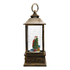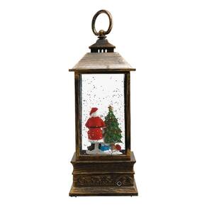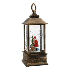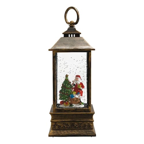Luminária em forma de lamparina de 22 cm de altura. Interior com enfeite no formato de Papai Noel e árvore de natal. Duas opções para ligar. Ao ligar de um lado, interior da lamparina se acende e líquido interno começa a se movimentar mexendo a purpurina que tem dentro. Ao ligar para outro lado, além do descrito anteriormente, começa a tocar música natalina. Funcionamento: 1 cabo USB ou 3 pilhas AAA. Material: plástico, líquido e resina