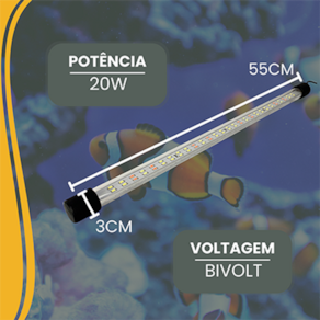 • Modelo: Artika Marine • Potência: 36w • Canais: 3x cool white 10000K, 3x deep blue 450nm, 2x Violet 420nm, 2x + UV 395nm 1x green 520NM, 1x Red 660NM • Quantidade de LEDs: 12 • Medidas da Luminária (CxLxA) - 22 x 11 x 3 • Lúmens: 1410 • Voltagem: Bivolt • Cabo de Energia Total: 2,1m • Cabo de Energia da Fonte até a Tomada: 0,8m / 80cm • Peso: 700g • Material do Suporte: Metal Esmaltado • Tamanho Máximo do Aquário: 50cm de Comprimento