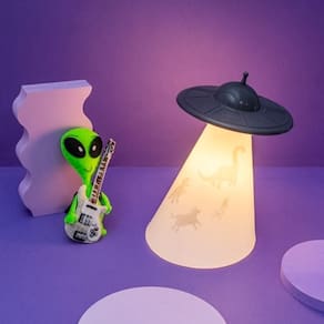 Escolha o que deseja abduzir com sua nova nave extraterrestre, através da cartela de adesivos para deixar sua decoração ainda mais personalizada. Cheia de personalidade, ela vai espantar a escuridão sempre que você tocar seu interruptor e ainda oferecer uma iluminação capaz de ficar ligada a noite sem atrapalhar ou prejudicar o sono de humanos.