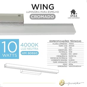 Com a Arandela Wing, a iluminação perfeita para seu espelho ou quadro está garantida Com LED integrado de 4000K, 10W e luz leitosa, seu ambiente ficará mais elegante e sofisticado. Além disso, seu acabamento cromado em alumínio e difusor em acrílico garantem qualidade e durabilidade. E o melhor de tudo: com grau de proteção IP44, pode ser utilizada em áreas úmidas sem preocupação