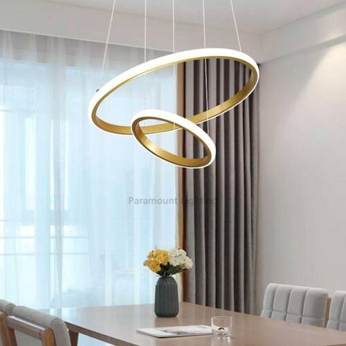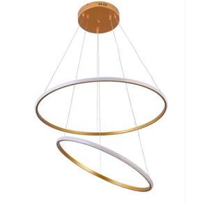 Especificacoes: Marca: Lustres Online Modelo: Anel Unidades por embalagem: 1 Cor: Dourado Tipos de fontes de luz: LED Inclui lampadas: Sim Com Wi-Fi: Nao E pendente: Sim Materiais: Aluminio Alimentacao: Energia Eletrica Potencia: 61 W Ambientes: Interior