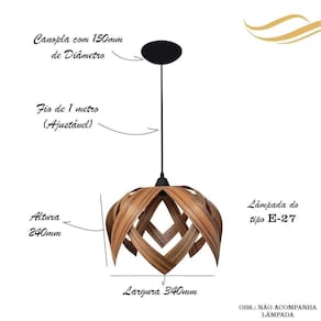 Especificações técnicas: Dimensões do produto CxLxA: 34 x 34 x 24cm; Peso do produto: 210g Cabo: PP Preto, 1 metro ajustável ; Soquete: tipo e-27; Lâmpada: aceita diversos tipos eletrônica ou LED - obs.: não acompanha lâmpada; Voltagem: 110v / 220v bivolt ;