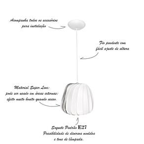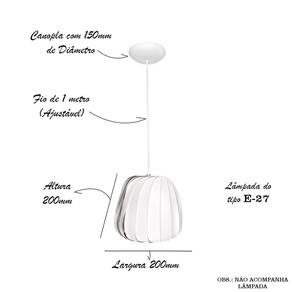 Especificações técnicas: Material: lâminas em ABS e MDF; Dimensões do produto cxlxa: 20 x 20 x 20cm; Peso do produto: 400g Cabo: PP, Cor Branco 1 metro ajustável ; Soquete: tipo e-27; Lâmpada: aceita diversos tipos eletrônica ou led - obs.: não acompanha lâmpada; Voltagem: 110v / 220v bivolt ;