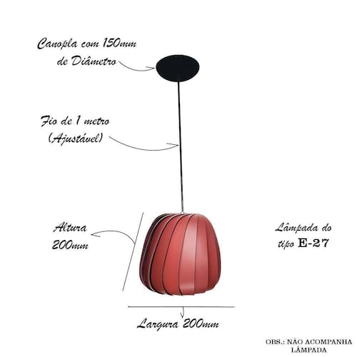 Especificações técnicas: Material: lâminas em ABS e MDF; Dimensões do produto cxlxa: 20 x 20 x 20cm; Peso do produto: 400g Cabo: PP, Cor Preto 1 metro ajustável ; Soquete: tipo e-27; Lâmpada: aceita diversos tipos eletrônica ou led - obs.: não acompanha lâmpada; Voltagem: 110v / 220v bivolt ;