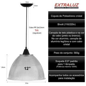 Luminária Para Galpão Industrial 12 Poleg. Extraluz Preto Ilumine o seu galpão industrial com estilo e eficiência utilizando a Luminária Para Galpão Industrial Extraluz. Com um design moderno e funcional, essa luminária pendente é perfeita para proporcionar uma iluminação de qualidade em ambientes residenciais ou comerciais. Fabricada em material termoplástico e liga metálica, a Luminária Para Galpão Industrial Extraluz é extremamente durável e resistente à umidade e maresia. Além disso, sua cor preta neutra combina com diversos estilos e estéticas, desde as mais vibrantes até as mais clássicas. Essa luminária possui um pendente prismático de 12 polegadas, com 20cm de altura e 31cm de diâmetro. O modelo Prismático Cristal traz um toque de elegância ao ambiente, tornando-o moderno e sofisticado. Além disso, o produto é bivolt, ou seja, pode ser utilizado em redes elétricas de 110v ou 220v. A Luminária Para Galpão Industrial Extraluz suporta lâmpadas de até 100W LED Branca Fria, proporcionando uma iluminação eficaz e perfeita para os olhos. Recomendamos o uso de lâmpadas fluorescentes frias ou incandescentes de até 60 watts para economia de energia e maior durabilidade. Com acabamento de teto de plástico meia lua, essa luminária é fácil de instalar, dispensando parafusos e furações. Basta fixá-la no teto pela pressão que faz com o cabo. Além disso, o produto é fabricado no Brasil, garantindo qualidade e confiança. Na caixa, você encontrará 1 pendente prismático com todos os acessórios necessários para a instalação. Basta colocar uma lâmpada de sua preferência e instalar no teto. O produto vai montado, facilitando ainda mais a sua vida. A Luminária Para Galpão Industrial Extraluz possui de 3 meses e não acompanha lâmpada. No entanto, se você desejar, poderemos enviar uma lâmpada junto com o produto. Realize a limpeza da luminária com o produto desligado da rede elétrica, utilizando um espanador de pó ou pano úmido com água. Nunca utilize soluções abrasivas. Se você deseja um ambiente moderno e uma iluminação eficaz para o seu galpão industrial, a Luminária Para Galpão Industrial Extraluz é perfeita para você. Aproveite e adquira a sua agora mesmo!