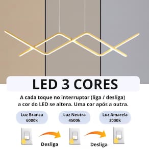 Luminária Pendente Teto 110cm x 92cm Linear Dupla Wave Raio Ondas Minimalista Gimpo KJDD-L-140 COR: DOURADO 1 x Luminária 110cm x 92cm Linear Dupla Minimalista Gimpo KJDD-L-140. LED 3 Cores: Branco quente 3000k, branco neutro 4500k e branco frio 6000k. Multitemperatura 3x1. Potência 36 Watts. Bivolt 110v/220v . Transforme seu espaço com elegância com a luminária suspensa de teto Wave Ondas Raio Gimpo KJDD-L-140. É a escolha perfeita para iluminar e modernizar qualquer ambiente com um toque minimalista. Combina materiais de alta qualidade, como o alumínio e silicone, para garantir uma iluminação suave e aconchegante. Uma peça sofisticada, delicada, que une beleza e funcionalidade. Versátil para uma variedade de ambientes. Já vem com LED multitemperatura de 36 Watts instalado, pronto para uso, com 3 intensidades de cores: branco quente 3000K , branco neutro 4500K e branco frio 6000K . A seleção das luzes é feita através do . Ao acender e apagar a luz liga / desliga é possível alternar entre os três tons de luz. Isto faz com que a cor do LED seja alterada, uma cor após a outra. Deste modo, controla-se a luminosidade e também a potência de Watts que é enviada para o LED, além da atmosfera certa, a qualquer momento, para refletir as mais diferentes emoções. É compatível com tensão Bivolt, o que permite ligar em 110v e em 220v. LED e driver já seguem instalados, com rabicho pronto para adaptação na corrente elétrica. Sustentável, econômica, de alta eficiência energética. Ainda, para maior comodidade e praticidade, acompanha kit fixação com travessa, parafusos, buchas e arruelas. Instalação descomplicada, fácil e segura. É uma luminária completa, ideal então, para iluminar diversos locais, tais como: salas de estar, halls, corredores, banheiros, lavabos, cozinha, penteadeiras, quartos, salas de jantar, bares, cafés, restaurantes, clínicas, salões, estúdios, home offices, etc. Pode ser utilizado individualmente ou em composições com outras luminárias. Um conceito contemporâneo para agregar estilo, requinte e sofisticação Luminárias Gimpo. Elementos de beleza que transformam decorações. Especificações: 1 x Luminária Linear Dupla Minimalista Wave Gimpo KJDD-L-140. Medidas luminária: 110cm altura x 92cm largura x 5cm profundidade. Base canopla : 60cm largura x 5cm comprimento e 2,5cm profundidade. Base de sobrepor. Cor da base: mesmo tom de cor da luminária. Fita de LED já instalada. Potência: 36 Watts. LED Driver 3 Cores Multitemperatura. Com proteção contra curto-circuito. Instalação: Corrente elétrica. Fiação rabicho já instalado no driver. Material: Alumínio, Silicone. Voltagem: 110v / 220v Bivolt . Acompanha kit parafusos, buchas, arruelas e travessa. Necessita montagem: fixação no teto e ligação elétrica. Medidas da caixa: 95cm x 29cm x 8,5cm. Peso: 1,5kg. Modelo: KJDD-L-140. Marca: Gimpo. EAN: 7898680305057. Sempre verifique a cor do produto ANTES de concluir a compra. Não fazemos alterações posteriores em pedidos. Imagens do anúncio são ilustrativas.