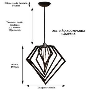 Pra você que está decorando ou buscando melhorar os seus ambientes, saiba que uma boa iluminação pode transformar o seu espaço, trazendo mais requinte, elegância, personalidade e conforto. Produto é enviado desmontado. Para melhor envio do produto, as hastes são enviadas desmontadas, a montagem é muito simples, e não necessita de nenhuma ferramenta, apenas encaixes. será enviado instruções de como montar . Especificações técnicas: Dimensões do produto cxlxa: 47 x 47 x 47cm; Peso do produto: 0,7kg Cabo: pp, cor preto, 1,5 metros ajustável ; Soquete: tipo e-27; Lâmpada: aceita diversos tipos eletrônica ou led - obs.: não acompanha lâmpada; Voltagem: 110v / 220v bivolt ; Produto irá desmontado e acompanha todos os componentes elétricos para instalação cabo, canopla e componentes de fixação . Marca: Não Informado