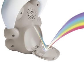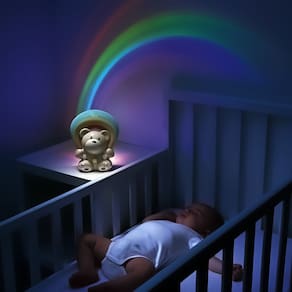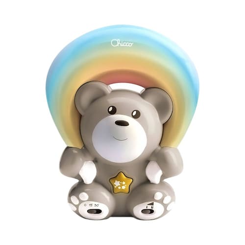O Projetor Rainbow Bear da Chicco possui dois modos de projeção: arco-íris estático + melodia clássica ou projeção de uma cor por vez + música new age. São 30 minutos de música clássica por Mozart ou New Age de Beethoven com projeção espelhada que permite a adaptação ao quarto.