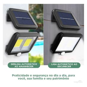 Especificações: - Fonte de energia: Raios Solares - LED: 160 Cob - Potencia de iluminação: 32 Watts E 1250 Lumens - proteção em Nível: IP65 - Distância de detecção: aproximadamente 5 m - Autonomia de iluminação: 3h a 4h em luz constante e 10h utilizando sensor de movimento em locais pouco movimentados. - Tempo Ligada ao detectar movimento: aproximadamente 20 Segundos Tempo renova a cada novo movimento - Tempo de vida do LED e Bateria: 50000 h - Cor dos LEDs: Branco Frio - Tipo de instalação: Fixado Na Parede - Medidas da luminária: 12,9cm x 14x8cm x 3cm - Medidas da placa solar: 12,7cm x 11,3cm x 3cm - Sensor de movimento ângulo: 120º - Material: ABS