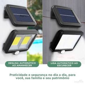 Especificações: - Fonte de energia: Raios Solares - LED: 160 Cob - Potencia de iluminação: 32 Watts E 1250 Lumens - proteção em Nível: IP65 - Distância de detecção: aproximadamente 5 m - Autonomia de iluminação: 3h a 4h em luz constante e 10h utilizando sensor de movimento em locais pouco movimentados. - Tempo Ligada ao detectar movimento: aproximadamente 20 Segundos Tempo renova a cada novo movimento - Tempo de vida do LED e Bateria: 50000 h - Cor dos LEDs: Branco Frio - Tipo de instalação: Fixado Na Parede - Medidas da luminária: 12,9cm x 14x8cm x 3cm - Medidas da placa solar: 12,7cm x 11,3cm x 3cm - Sensor de movimento ângulo: 120º - Material: ABS