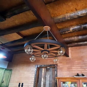 Nossa linha de móveis está sempre crescendo e agora traz para você essa linda luminária para decorar diversos ambientes da casa. Essa peça vai com certeza deixar sua casa mais bonita. A luminária é uma réplica rústica de roda de carroça, fabricada em MDF e pintada à mão. O acabamento é envernizado, proporcionando um toque envelhecido perfeito. Ideal para iluminar e decorar áreas como garagens, espaços de churrasco, bares, chácaras, lanchonetes, casas de campo, pousadas e muito mais.