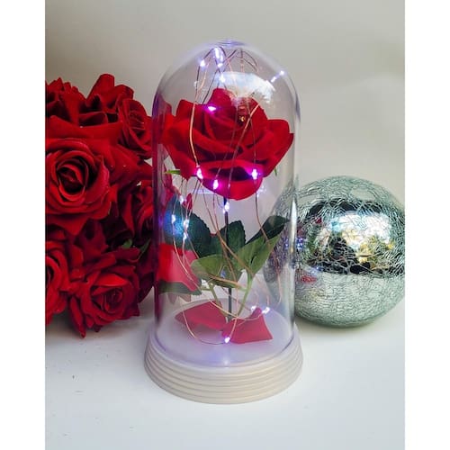 Luminária a rosa encantada vermelha 20 cm base pérola frio