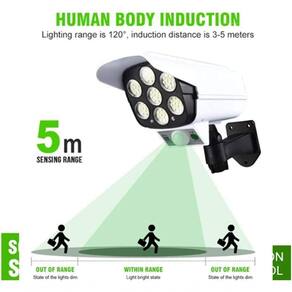 Luminaria Solar Dummy Camera é composta por 77 leds que são recarregados por um painel solar de 5 volts. Captando presença a partir de 5 metros. A Luminaria solar Dummy camera conta com um controle remoto que permite alterar entre 3 funções, para que o cliente decida qual é a mais viavel.