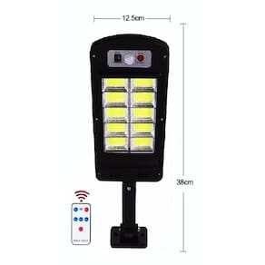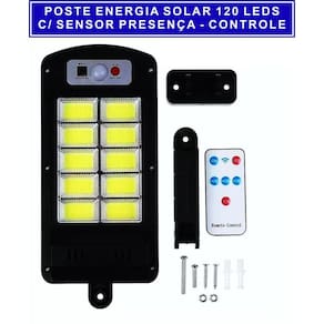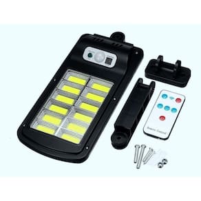 Luminária solar inteligente refletor led 100w poste sensor presença controle 120 leds cob branco luatekEsta é uma luminária solar inteligente led poste 100w sensor presença controle remoto com 120 leds cob branco, resistente a poeira e chuvas.Com um braço articulado e ajustável, essa luminária solar inteligente led pode ser instalada como poste, podendo ser instalado em qualquer lugarQue você precise, pois são 120 leds cob de alta intensidade o que totaliza 100w de potência.Essa luminária solar vem com sensor presença inteligente com 3 modos de uso, onde você escolhe de que forma deseja que ele acenda, além disso o kit vem com controle remotoPara que você possa configurá-lo a distância.A luminária solar inteligente 100w tem autonomia de até 10 horas nos modos de uso 1 e 2, com placas solares polyscon você tem muita tecnologia ao gerar a própria energiaPara alimentar as baterias e acender seus leds quando precisar sem a necessidade de nenhum outro acessório para gerar energia para seus leds.Destinada para áreas externas, essa luminária solar inteligente vem com kit de instalação completa, basta você escolher o local e pronto, instale e tenha luz de led de alta intensidadeA qualquer hora e em qualquer lugar.Com muita economia, praticidade e segurança essa luminária solar inteligente é ideal para fachadas, jardins, corredores, decks, piscinas e etc.Especificações técnicas:. Placa solar acrílico policristalino de alta eficiência. Potência dos leds 100w. Lúmens: 3000lm. Alcance da iluminação: ângulo de até 120 graus.. Temperatura/cor da luz: 6000k branco. Possui 120 cob/led super potente .. Certificação ip65 resistente a chuva e poeiras.. Bateria de lítio 2400mah, 3,7v.. Distância de detecção: 2 a 5m. Autonomia de até 10 horas utilizando o primeiro e segundo modo de funcionamento.. Tipo de instalação: fixação em parede com parafusos e bucha.. Interruptor: botão on/off. Rotação da luminária: até 120º. Dimensões da luminária: 37cm x 15cmPossui sensor de movimento e 3 modos de funcionamento que podem ser configurados facilmente através do botão principal.Atenção: o ideal é que luminária seja carregada por 8 horas exposta ao sol. Após estar carregada aperte o botão principal 3x para reativar os modos de funcionamento.Modo 01: se mantem apagado durante a noite e só acende ao detectar movimentos e ativa 100% da potência.Modo 02: se mantém aceso a noite toda com 1/4 de sua capacidade e ao detectar movimentos, ativa 100% da potência.Modo 03: fotocélula acende automaticamente ao anoitecer e apaga ao amanhecer.Itens incluso:. 01 luminária solar. 01 controle remoto. 01 braço para instalação. 01 jogo de buchas e parafusos para fixação.Importante:. Garantia contra defeito de fabricação 30 dias.