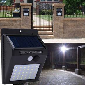 Luminária solar com detector de movimento e acendimento automático acionada pela intensidade de luz ambiente.