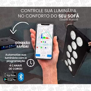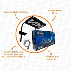 Luminária Solara plus Ocean tech bivolt Tamanho aprox: 25x45x3cm Para aquários até 100cm A luminária solara plus é de para aquários marinhos com corais de máxima exigência ou coluna de água alta. Com cobertura de área máxima de 100cm é ideal para todas espécies de corais e até mesmo os mais exigentes. 4 canais de cores ajustáveis via app/bluetooth Potência 180w / 8080 lúmens / bivolt Peso: 6kg Área de cobertura aprox: 100 cm Com 60 power led's de 3w sendo: 12 x deep blue 450nm 12 x cool white 10000k 12 x light blue 470nm 8 x violet 420nm 4 x uv 395nm 4 x green 520nm 4 x cyan 500nm 4 x red 660nm Marca: Não Informado
